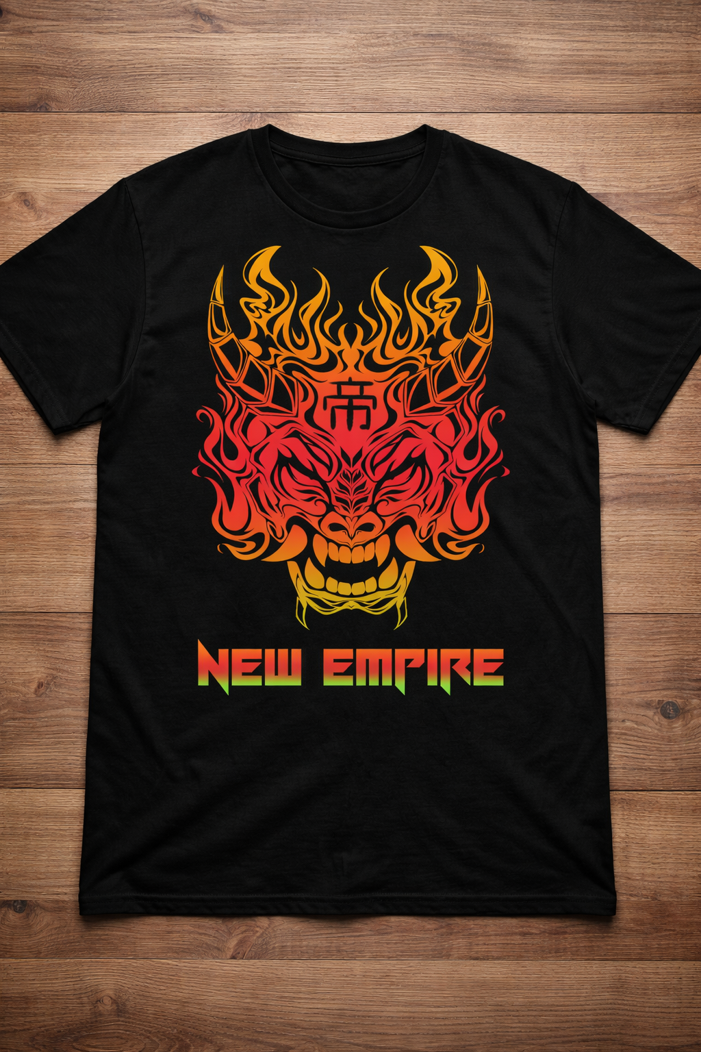 A estampa NEW EMPIRE traz uma máscara oni central em traços marcantes, envolta por chamas em degradê vibrante que passeiam entre amarelo, laranja e vermelho. O contraste com o fundo preto valoriza cada detalhe da arte, criando uma peça de presença forte e visual agressivo. Inspirada na estética oriental e reinterpretada dentro do universo streetwear, essa composição transmite poder, imponência e personalidade. A tipografia robusta na base reforça o conceito da peça, tornando a camiseta ideal para quem busca um visual ousado, moderno e cheio de identidade.